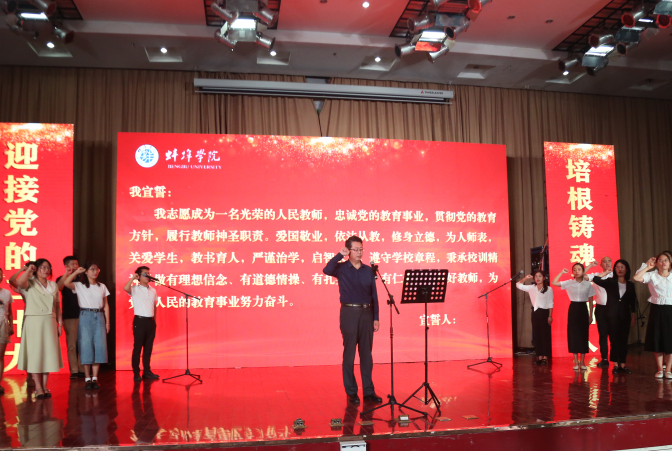随后,全体新教师庄重宣誓,“做有理想信念,有道德情操,有扎实学识,有仁爱之心的好教师,为党和人民的教育事业努力奋斗!”声音响亮,在会场中久久回荡。