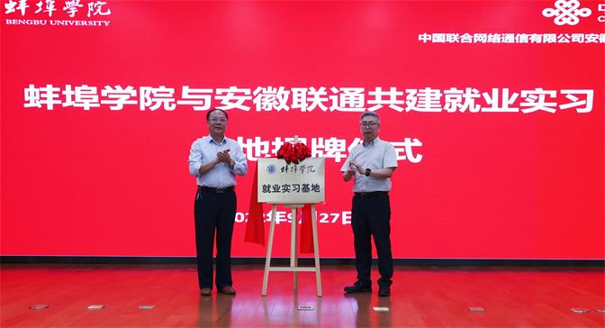 陈国龙和韩冰共同为蚌埠学院大学生就业实习基地进行揭牌。郭有强和陈铭分别代表双方签订校企战略合作协议书。