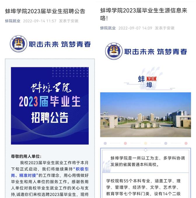 为有效对接用人单位,学校印发了2023届毕业生生源信息宣传册,重点介绍了学校概况、招聘会预约方式、生源结构、联系方式等;面向用人单位发布“蚌埠学院2023届毕业生招聘公告”,秉持“积极引岗、精准对接”的工作理念,用心用情做好用人单位服务工作。学校相关职能部门、各二级学院通过线上线下的方式,将学校关于2023届毕业生就业工作的相关信息及时推送至用人单位,邀请各用人单位前来进校选聘人才。