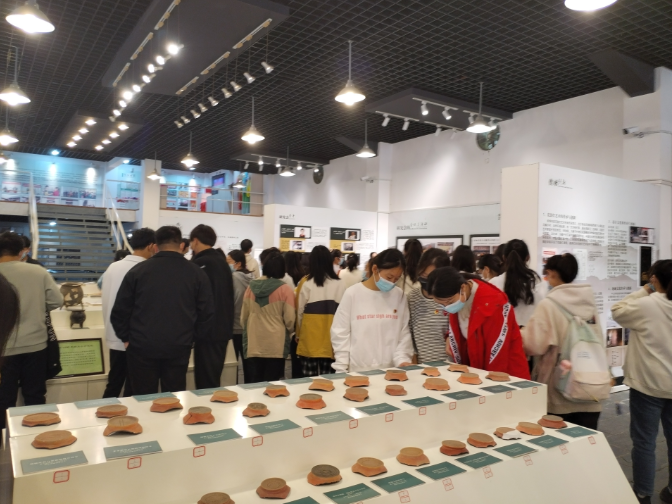 中午12点半,学生党员们佩戴着闪亮的党徽,来到学校淮河文化中心,进入淮河文化展进行参观。淮河文化展向学生党员展示了蚌埠学院淮河文化研究中心近几年工作情况和研究成果,是蚌埠学院重视和研究淮河文化,并将成果应用于教育教学和服务地方经济文化建设的真实记录。在展馆工作人员的带领下,全体学生党员依次参观了淮河文化研究中心工作开展情况展区、淮河文化研究中心成果与实物展区,淮河文化为主题的手工作品展区,国家级非物质文化遗产花鼓灯文化展区。展厅里特色文化作品和历史文物让同学们目不暇接,部分学生认真观看展区作品,并向工作人员积极提问,现场学习氛围非常热烈。