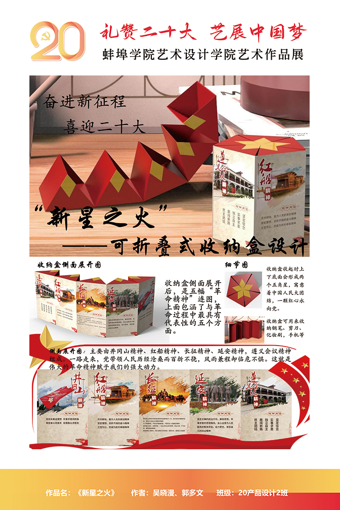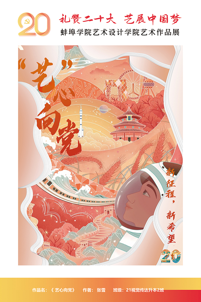 为热烈庆祝中国共产党第二十次全国代表大会胜利召开,以优秀的艺术作品歌颂党的光辉历程和伟大成就,展望辉煌的中国梦,讴歌伟大的新时代,献礼党的二十大,抒发师生“‘艺’心向党”的炽热情怀,值党的二十大召开之际,蚌埠学院举办了以“礼赞二十大 艺展中国梦”为主题的艺术作品展。