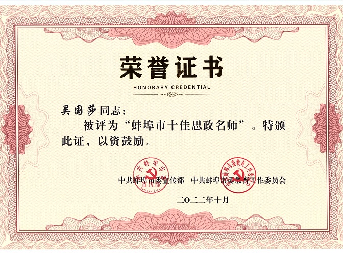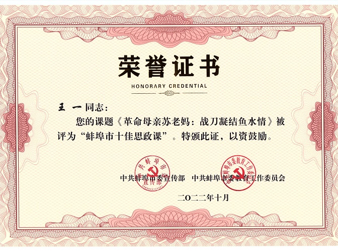 近期,中共蚌埠市委宣传部、中共蚌埠市委教育工委开展的“蚌埠市十佳思政课”“蚌埠市十佳思政名师”评选名单揭晓,我校王一老师的作品获评“蚌埠市十佳思政课”,吴国莎老师获评“蚌埠市十佳思政名师”。蚌埠学院马克思主义学院是驻蚌高校唯一获奖单位。