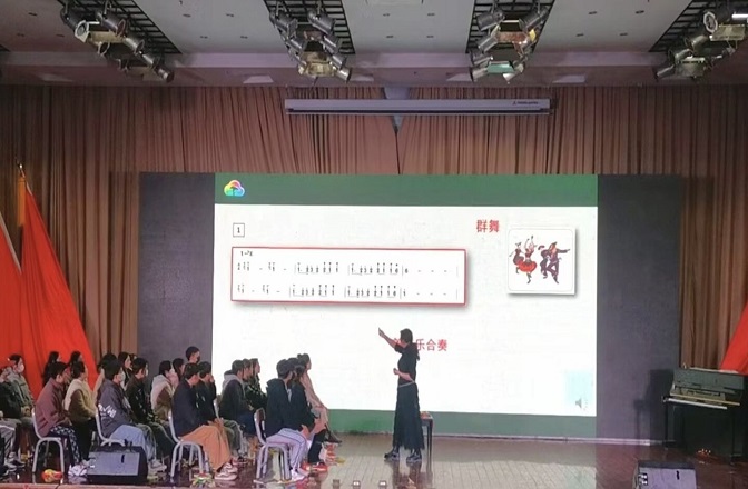 王乐老师协同19音乐学3班同学们合作完成欣赏课《北京喜讯到边寨》。在课堂创编环节,王乐和同学们利用手中的小棒挥舞出不同的节奏,共同走进这首作品所表达的情境。课上王乐老师与同学们的互动积极有效,课堂氛围欢快热烈,也帮助同学们充分感受到了音乐的魅力。陈婷老师对本节课整个教学设计作出精彩点评,对同学们未来的教师生涯也提出了一些建议。同学们纷纷表示受益匪浅,并立志以后要成为优秀的音乐老师。