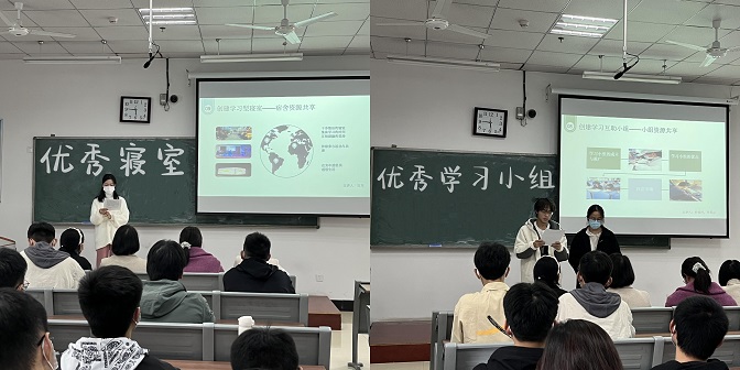学习委员曾暄轲从班级出勤率、学习风气、学生参加竞赛及活动等方面汇报了班级目前学习现状,并说明本次学风研讨班会将从“加强自我认知,适应大学生活”、“营造学习氛围,争做学习先锋”和“建立学风保障,施行长效机制”三个环节依次展开。优秀学长圣习洋的经验分享、学习互助型小组成员曾暄轲、胡慧心的分享以及身边多名同学自由交流学习感悟,同学们深受启发。班会结束,全班同学签署了加强学风建设倡议书及承诺书。