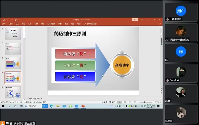 为提高毕业生求职技能,帮助他们制作突出自身优势的简历,同时也回应2023届毕业生在就业意向调查中所反馈的简历制作培训需求,11月30日中午,杨小云老师以线上腾讯会议的方式举办了求职简历制作讲座,讲座面向材料与化学工程学院和外国语学院全体毕业生。