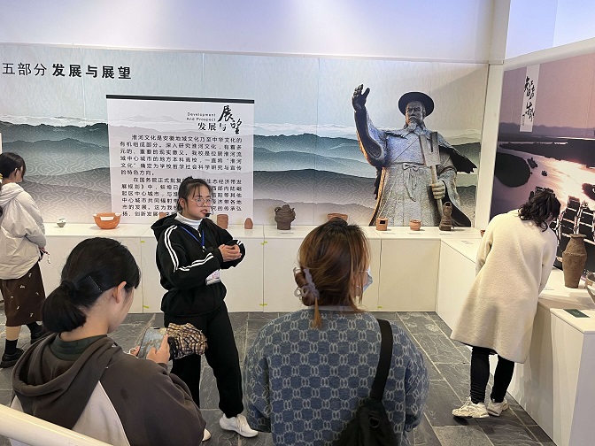 淮河文化展览馆展示的是淮河文化研究中心取得的成果与实物、以淮河文化为主题创作的手工作品以及国家级非物质文化遗产花鼓灯。淮河文化在中华文化传承和发展过程中具有重要地位,淮河流域是中国文化精神阐发的根据地之一。在淮河文化展览馆讲解员声情并茂的叙述下,同学们对优秀的淮河文化有了更深的了解,其中的陶器、传统服饰、相关记录书籍等让同学们惊叹不已。