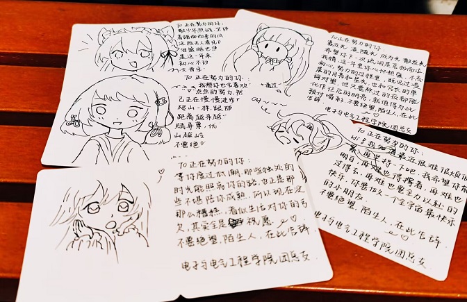 同学们希望用这样一种温暖的方式来帮助考研学子调整心态,舒缓他们的心理压力,向着最后的胜利全力以赴。同学们祝愿学长学姐们在最后的复习时间里要注意营养、劳逸结合,以最好的状态迎接考试。看到大家收到卡片后露出的笑容,同学们也非常感动。