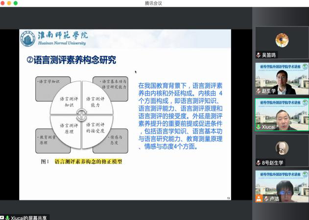 为进一步促进学科专业建设与大学英语教学改革,12月2日和3日,外国语学院邀请安徽省外文学会大学英语教学工作委员会主任王先荣教授、蚌埠医学院公共基础学院外文教研室主任郭书法教授和夏娟副教授、淮南师范学院外国语学院院长方秀才教授、安徽省外文学会会长朱跃教授围绕大学英语教学改革理论与实践、课程思政、英语教师测评素养、“理解当代中国”等主题为外国语学院全体教师作了4场精彩的学术讲座。讲座采取线上与线下相结合的方式进行,由外国语学院院长赵生学与副院长卢洁主持,外国语学院全体教师参加了本次学习与交流活动。