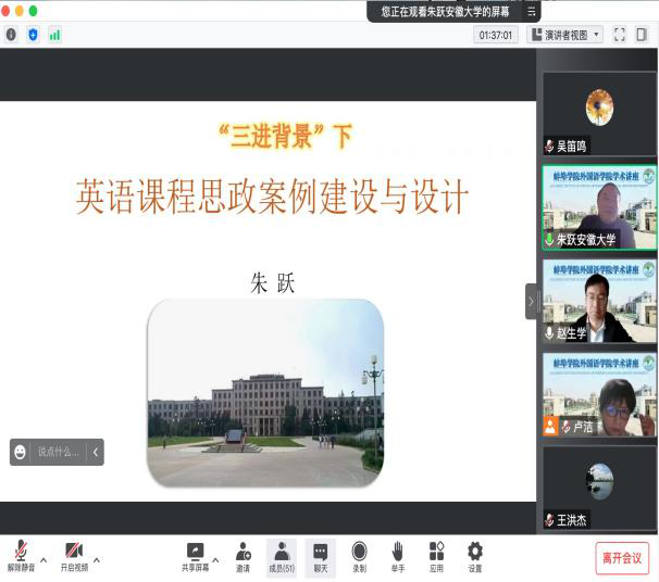 朱跃教授讲座的主题是“理解当代中国与课程思政建设”,讲座围绕《理解当代中国》的课程理念、教学方法、设计路径、评价体系等方面,阐述了开展“理解当代中国”主题教育、“三进”和英语课程思政教育的现实必要性,重点介绍了英语课程思政前沿理论、课程设置、体系建设、主要问题和方法策略等。他提醒教师,要结合校本实际理性评价、辩证对待教学理论,走出语言教学的小逻辑,以外语为窗口传播中华优秀传统文化,培养具有中国思想、中国理论、中国智慧,了解国内外政治、经济、文化知识和跨文化交流能力的复合型人才。