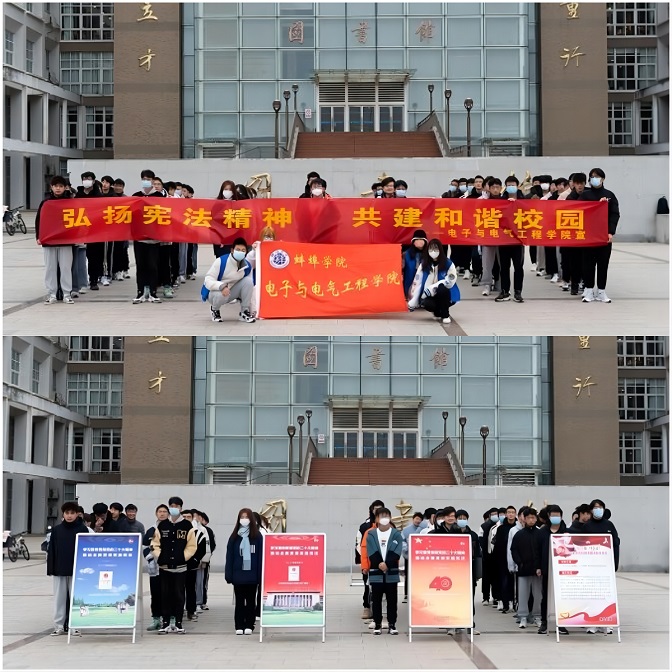 为深入学习贯彻党的二十大精神,深入学习宣传习近平法治思想,弘扬宪法精神,维护宪法权威,推动宪法全面实施,在国家宪法日当天,电子与电气工程学院联合保卫处在图书馆前举行“学宪法,讲宪法,从你我做起”签名活动。