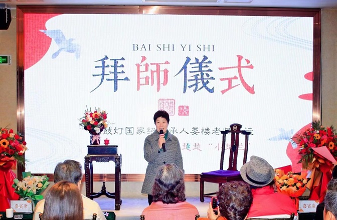 仪式按照传统的拜师礼仪程序依次进行。徐洪琴表示祝贺并讲话,她首先感谢娄楼老师长期以来对学院工作的支持,和对张楚楚教师的认可,希望张楚楚在今后的学习中,既要学习掌握老师的高超技艺,更要学习和延续老师身上优秀品格,成为一位德、艺并优的花鼓灯传承人,为蚌埠花鼓灯的传承、发展、创新作出自己的贡献!