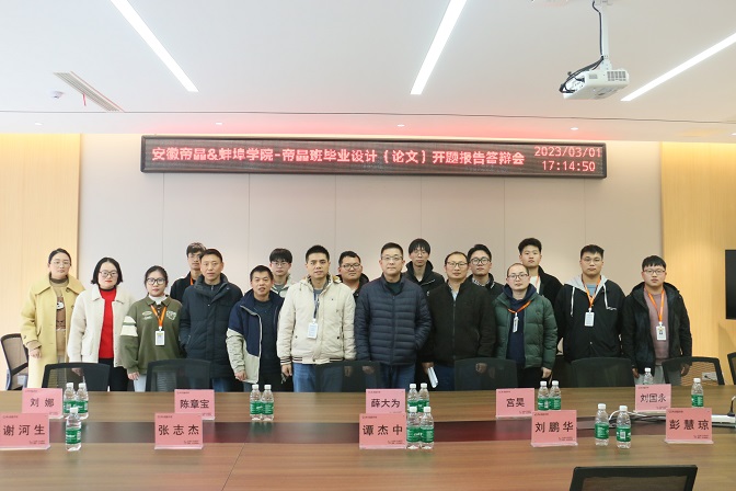 为深化校企合作、加强人才协同培养,3月1日下午,蚌埠学院“帝晶班”2023届毕业设计开题答辩在安徽帝晶光电科技有限公司A110会议室举行。电子与电气工程学院副院长薛大为,数理学院副院长宫昊,电子与电气工程学院电子信息、自动化教研室主任刘国永、陈章宝及指导老师刘娜、李壮,公司人资高级经理谭杰中、电子部经理刘鹏华、研发部高级工程师彭慧琼、墨方研发中心高级工程师童洁、工程技术中心经理谢河生共同担任答辩评委。“帝晶班”10名学生参加开题答辩。