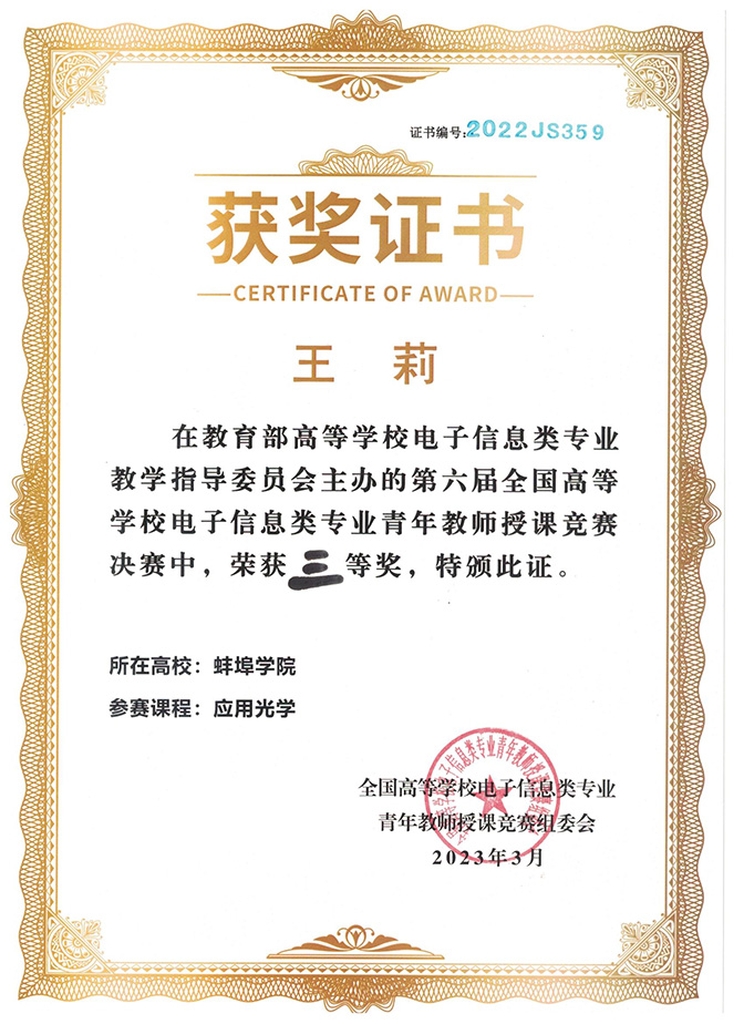 本届竞赛由教育部高等学校电子信息类专业教学指导委员会主办,重庆邮电大学承办,竞赛共有全国97所高等院校182名老师参加。大赛分为预赛和决赛两个阶段,王莉在预赛中从华东赛区脱颖而出获得参加决赛的资格。决赛中,参赛教师通过抽签确定比赛顺序和授课内容,进行20分钟现场教学展示。大会特邀6位国家级教学名师、25位省级教学名师和10位教指委委员组成评委会,综合现场教学内容、教学组织、教学手段、微课与教学内容结合、教学艺术、特色与效果等方面情况,进行盲评打分。经过激烈的角逐,王莉以《应用光学》课程中的“望远镜的工作原理”为决赛内容荣获三等奖。