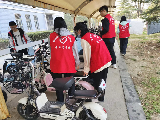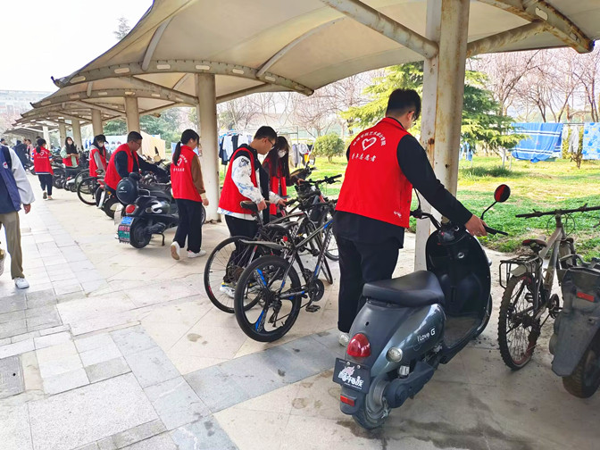 3月27日下午,校园内出现了一抹亮丽的“红色”风景线。青年志愿者们遍布校园各个角落,对校园内无序停放的自行车进行集中停放。志愿者们干劲十足,团结协作,将一辆辆共享单车整齐摆放,整理成排。同时,志愿者们还引导骑行的学生有序停车、劝阻不文明停车行为。
