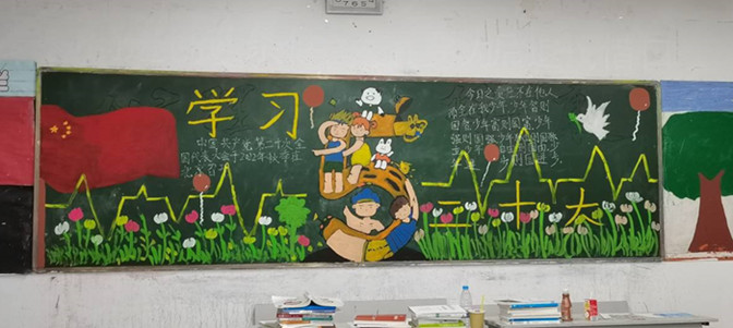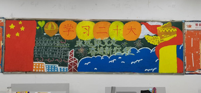 各班级踊跃参与,同学们通过查阅资料规划板报内容,讨论关于板报架构、刊头设计、以及板报图画的设计,同时也通过大量的色彩来表现主题。在同学们天马行空的想象和不辞辛苦的创作下,各班级呈现出来的结果异彩纷呈,不仅内容丰富,且设计新颖。他们紧扣“学习党的二十大”的主题,通过一双双巧手,挥洒笔墨。将一面面的黑板绘成学习宣传贯彻党的二十大精神的阵地。在同学们丰富的想象和创作下,各班级呈现出来的板报效果异彩纷呈,不仅展示了同学们意气风发的精神风貌,更传承了中国共产党的红色基因和血脉。