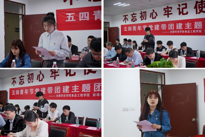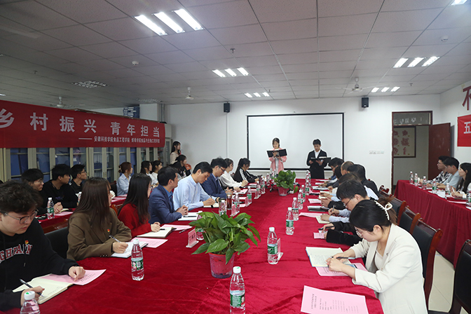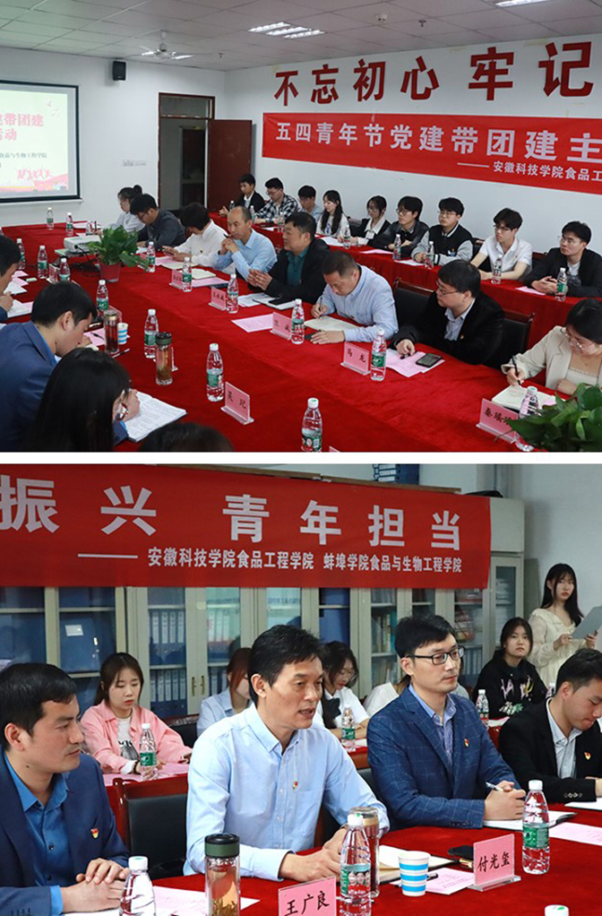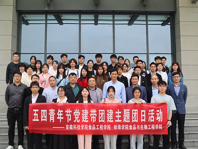 为深入开展学习贯彻习近平新时代中国特色社会主义思想主题教育,以主题教育成效推动学院各项工作高质量发展,2023年5月5日,蚌埠学院食品与生物工程学院联合安徽科技学院食品工程学院共同举办主题为“乡村振兴,青年担当”的五四青年节党建带团建主题团日系列活动,把学习贯彻习近平新时代中国特色社会主义思想这一重大政治任务作为鲜明主线,不断推动主题教育持续往深里走、往实里走、往心里走。安徽科技学院食品工程学院党委书记付光玺、党委副书记王广良,团委书记赵传磊,团委副书记吴玘,辅导员程韬,丁佩芬及团学青年代表应邀来学院开展主题团日活动,食品与生物工程学院党委书记王永斌、院长张斌,副书记伍亚华、副院长马龙、党务秘书闫利萍、团总支负责人何珊、团总支副书记秦瑶瑶、辅导员胡志祥和团学青年代表参加本次活动。