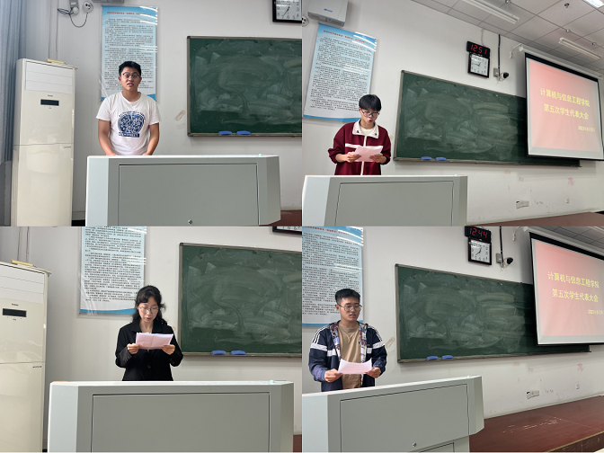 新一届学生会主席团4名候选人依次发表竞聘演讲,并采用无记名投票差额选举方式产生了杨乐乐、贺婧、周宣三名同学为计算机与信息工程学院第二十二届学生会主席团成员。