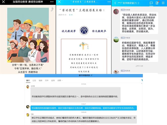 活动期间,20级、21级、22级共计26个班级的同学在辅导员的带领下开展“劳动教育周”主题班会,集中学习中共中央国务院《关于全面加强新时代大中小学劳动教育的意见》《蚌埠学院大学生劳动教育实施方案》等有关文件精神。学院6个教研室老师们通过线上交流,阐述了劳动教育的作用,并就如何在自己的教学中践行劳动精神发表了意见。此外,学院团总支新媒体中心还举办了主题摄影展和H5大赛等其他形式的线上劳动宣传教育,促进同学们在学习之余,感受劳动的魅力与价值,弘扬热爱劳动的中华优秀传统美德。