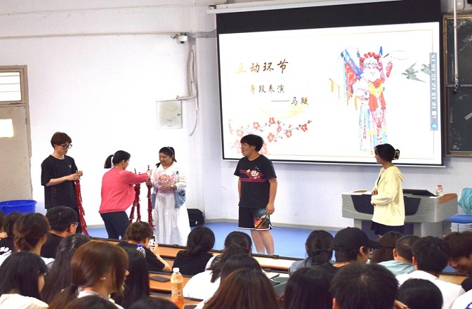 泗州戏,又名拉魂腔,是安徽主要地方剧种之一,2006年入选首批国家级非物质文化遗产名录。讲座由泗州戏剧院业务科科长、国家二级演员、省级泗州戏非遗传承人李芳芳担任主讲,国家一级演员陆为为、国家一级演奏员张俊峰、国家二级演员苏静依次登台,给同学们带来了精彩的泗州戏经典唱段。艺术家们从泗州戏的发展及风格特征,向师生们介绍和展示了泗州戏的独特魅力。讲座中不但有现场展示,还穿插了热烈的互动环节,使同学们更加近距离地感受到泗州戏的魅力所在,讲座现场气氛活跃,掌声不绝。