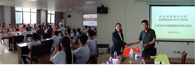 怀远特教学校一行35名师生首先参观了材料与化学工程学院。在综合楼F1414会议室,双方签订了大学生社会实践基地协议书。仪式由材料与化学工程学院党委副书记朱银邦主持,怀远特教学校副校长常仁敏简要介绍了学校办学理念、取得的成绩以及教师队伍建设情况;材化学院院长李宗群对来访师生表示了热烈欢迎,并介绍了材料与化学工程学院基本情况,他指出大学生志愿服务活动是促进学校德育工作,让学生接触了解社会的良好途径,希望双方互助交流,共同为同学们健康成长创造条件。