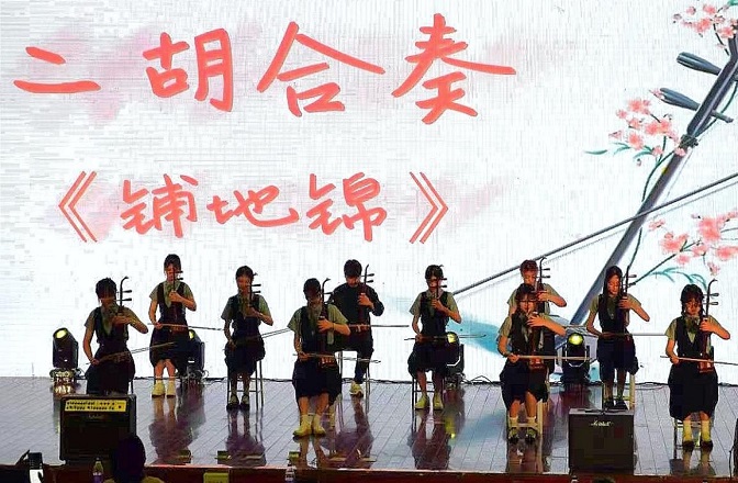 表演在一首古筝合奏中拉开序幕,讲述了梁祝凄美的爱情故事。演出中传统与流行两种音乐风格之间碰撞交流,舞台氛围伴随着直击心灵的声音被推上热潮,竹笛独奏《红高粱叙事曲》悠扬悦耳,流行歌曲《传奇》和声婉转动听,表演形式多样,最后演出在一首气势磅礴的大合唱《长征组歌》中落下帷幕。