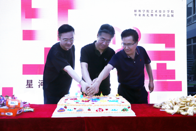 仪式的第二项,在鲜花、气球与闪光灯的簇拥中,艺术设计学院院长胡飞、党委副书记高善春、副院长王磊及艺术设计学院部分教师在学生们的欢呼声中走上红毯。胡飞、高善春分别致辞,希望毕业生们能够承载着蚌埠学院的梦想与荣光,肩负着蚌院人的未来与希望,乘风破浪,踏浪前行。随后,王磊宣布艺术设计学院2023届毕业典礼暨毕业设计展开幕仪式正式开始。