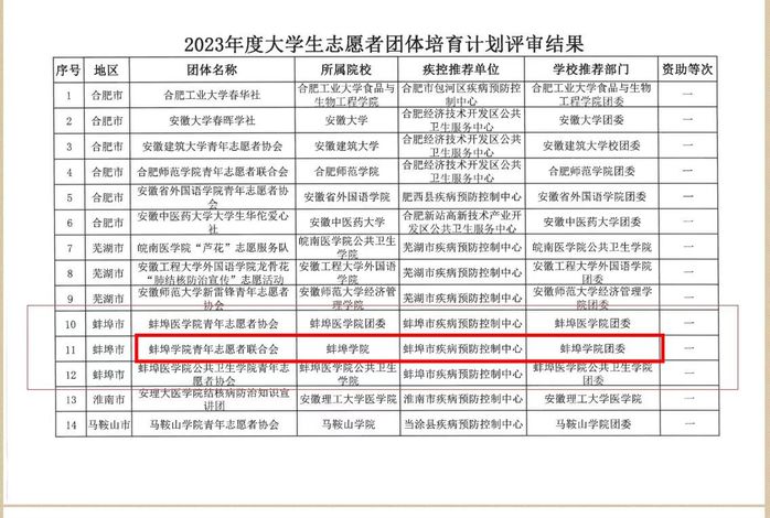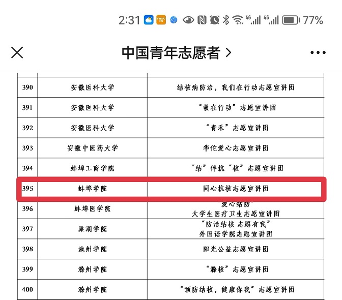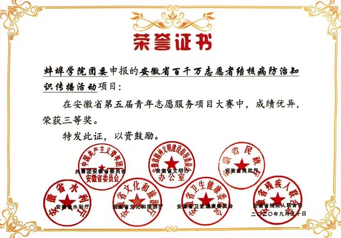 自2017年起,蚌埠学院青年志愿者联合会连续六年荣获安徽省大学生志愿者团体培育计划资助,2019年起更是连续四年荣获一等资助。在2020年安徽省百千万志愿者结核病防治知识传播活动中,我校分别荣获优秀志愿者个人、优秀志愿者团体。防治结核病活动被学习强国、中国青年网、创青春、安徽学联等多家媒体报道。