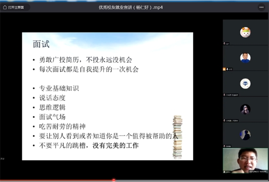 4月22日,2015届优秀校友杨仁好为同学们做了就业宣讲。宣讲会上,杨仁好结合自己求学和就业的经历,针对目前大学生就业的大环境、就业心态和就业价值观的现状,从职业发展前景、单位需求导向、就业准备选择三个方面,建议同学们在校期间一定要有目标,要沉下心来学习好专业知识,提高自己的综合素质和能力。在就业时,要积极主动,明确自己的就业方向和目标,先就业后择业再创业,适合自己的就是最好的。在工作岗位上,要勇于担当,乐于助人,团队合作,争做敬业勤奋、责任心强、执行力强的优秀员工。