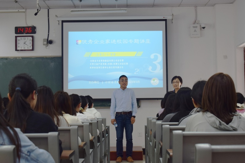 在外国语学院举办的宣讲会上,安徽省丰彩玻璃制品有限公司总经理郑骄以自己的工作经验为基础,分析了创业与就业的关系,建议同学们先夯实专业基础,锻炼自己的能力、提升自己的认知,再选择恰当的时机进行创业或就业。