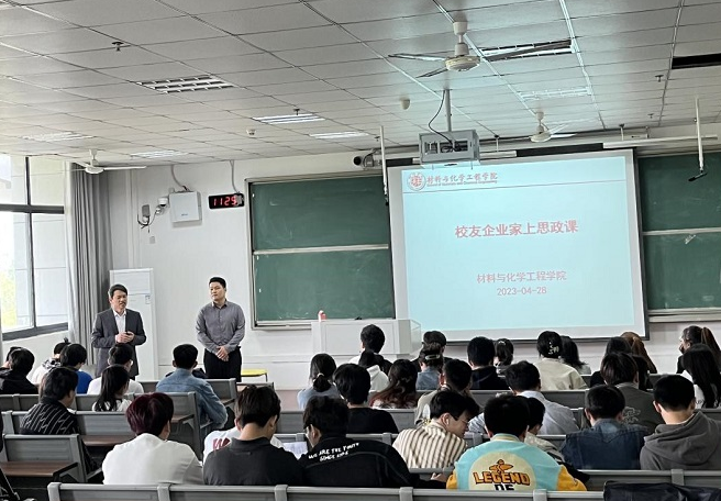 材料与化学工程学院思政课堂上,2016届校友毛长军,结合自己毕业后的职业发展历程分享了就业、择业相关经验,并强调了在职业发展中目标与规划的重要性,同时鼓励同学们要想成就一番事业,必须拥有远大的理想和坚定的信念,坦然面对人生中的逆境,以顽强的精神,锤炼意志品质,增长学识才干,练就过硬本领,才能实现自己的人生目标。毛长军校友还强调:同学们在立鸿鹄之志的同时,还要把个人的理想追求融入党和国家事业之中,个人发展要与党和国家事业发展同频共振,在实现中华民族伟大复兴的伟大事业中绽放出青春的光彩。
