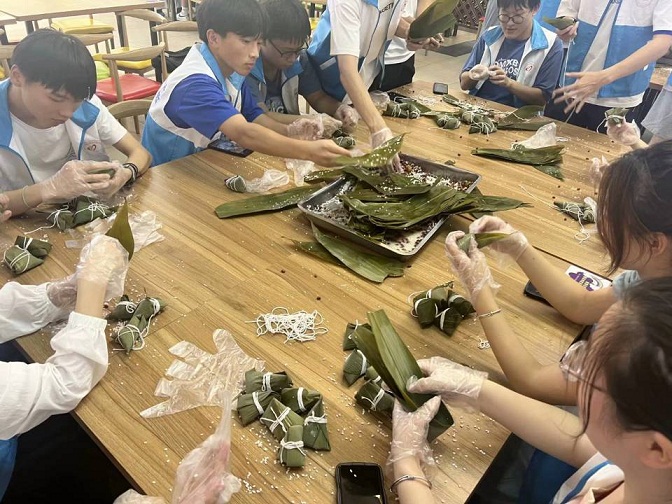 活动现场,糯米、粽叶等摆放整齐,大家认真学习了粽子的包法,只见粽叶在她们的双手间翻转成了漏斗状,用糯米将粽叶充实包好后,再用细绳一绕、一捆,一个个小巧可爱的粽子就成型了。同学们热情高涨,一边听着包粽子过程的讲解,一边迫不及待地行动起来,熟练的“巧手”带着“新手”相互配合,十分默契。折粽叶、装米、定型、打结,很快一个个粽子就做好了。由于经验不足,同学们刚开始出现了漏米、包住这头裹不住那头等情况,但大家不气馁,在不断的尝试下,渐渐摸索出门道,一个个棱角分明的粽子在巧手下逐渐成型。同学们兴致高昂,看着自己的劳动成果,笑容溢于言表,餐厅里洋溢着欢声笑语。