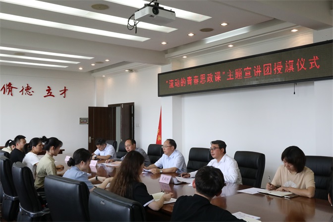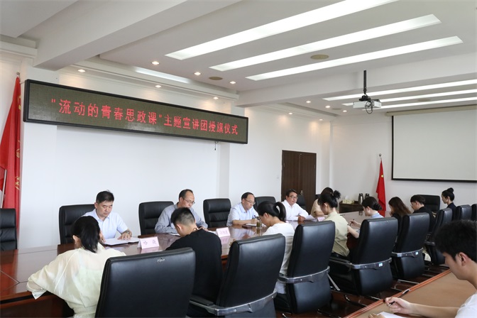 为在广大学生中开展习近平新时代中国特色社会主义思想宣讲,推动青年学生自觉以习近平新时代中国特色社会主义思想武装头脑、指导实践,6月13日下午2:40,蚌埠学院“流动的青春思政课”主题宣讲团授旗仪式在行政楼第二会议室举行。蚌埠学院党委书记陈国龙为宣讲团授旗,党委宣传部、团委、马克思主义学院主要负责人,理论宣讲团成员约30余人参加仪式。