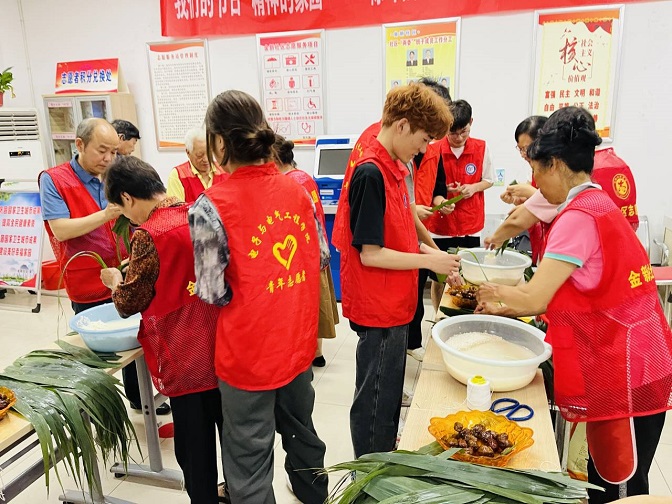 两片粽叶、一勺糯米、一绑一系,一个个三角粽子就成形了。志愿者们认真选取粽叶,将配料填装好,用细绳将其包住放入蒸锅中,耐心等待出炉。随后将包好的粽子平均分配好,每个带队的队长带领自己的队员,到社区老人家送粽子。社区居民的热情欢迎,让志愿者们忘记了包粽子的辛苦,每个人都露出了灿烂的笑容。送粽子活动,不仅弘扬了传统文化、传递了传统美德,而且还让老人感受到志愿者浓浓的关爱。