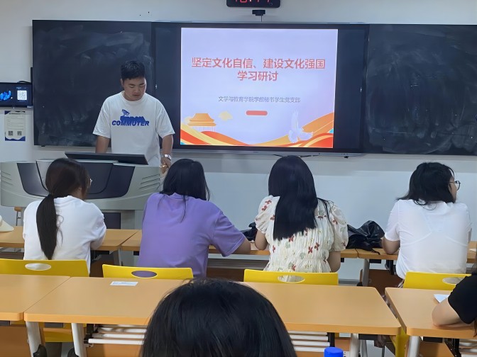 为深入推进学习贯彻习近平新时代中国特色社会主义思想主题教育,文学与教育学院学前秘书学生党支部于2023年6月21日在教学楼B324开展“坚定文化自信、建设文化强国”研讨交流活动。
