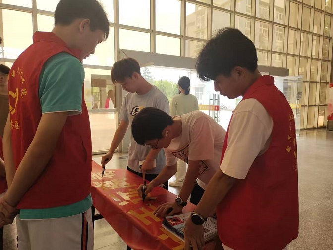 在B楼大厅,宣讲志愿者们积极宣传禁毒知识,认真负责地向广大青年讲述禁毒的重要性和防范手段,以提高大家的防范意识,同时现场发放宣传禁毒资料扩大宣传面,也邀请同学们在横幅上承诺签字以表明禁毒的决心和态度。