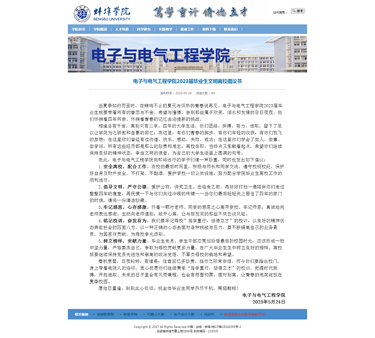 学院党委坚持“以生为本”的工作理念,精心谋划制定《电子与电气工程学院2023届毕业生文明离校教育方案》《电子与电气工程学院2023届毕业生离校工作方案》,强化组织领导,细化责任分工,整体部署2023届毕业生文明离校教育和离校工作安排。学院先后召开“青春不散场,回忆永留存”毕业班安全文明教育、感恩诚信教育、就业创业指导和心理帮扶主题班会,开展毕业生党课教育、毕业生留言征集活动、编写学子风采录、毕业生经验交流会、毕业生征兵宣传等营造温馨毕业氛围,通过学院公众号和QQ空间推送《电子与电气工程学院2023届毕业生文明离校倡议书》等文明离校宣传材料,引导毕业生顺利毕业、文明离校。
