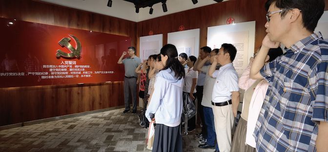 为深入推进学习贯彻习近平新时代中国特色社会主义思想主题教育工作走深走实,7月1日,数理学院组织37名师生党员代表赴怀远县龙亢镇新四军淮上办事处旧址参观学习,接受红色教育,并开展重温入党誓词活动。