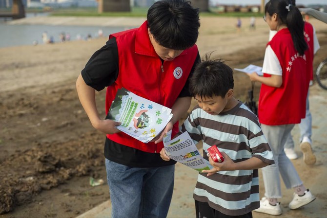 图为实践团成员在淮河岸边发放生态文明宣传单