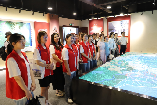 在对“书本上的淮河”有了初步了解之后,观察团前往水利部淮河水利委员会继续“发展观察”实践之旅,走近“新时代的淮河”。在治淮陈列馆内,淮河流域沙盘模型、大事记、治淮历程等珍贵的历史图片、展品、史料集中展示了淮河的自然历史演变、流域文化、新中国治淮历程及新中国治淮取得的丰硕成果,生动再现了新中国波澜壮阔的治淮历史画卷,帮助观察团成员进一步认识淮河,了解淮河流域文化。