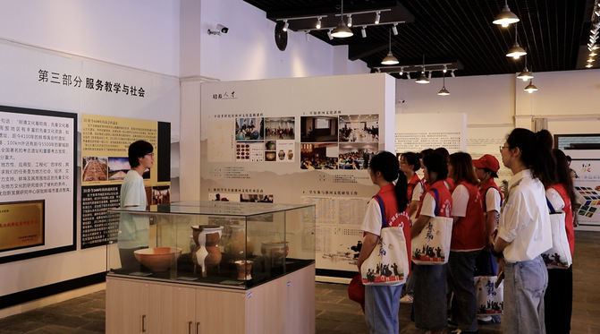 发展成就观察实践团队在前期查阅资料、集中讨论的基础之上,首先来到了蚌埠学院淮河文化研究中心,近距离观摩了双墩遗址、禹会村遗址、垓下遗址出土的文物;通过聆听讲解、翻阅文献等方式详细了淮河文化的历史、淮河流域的治水成就、淮河文化研究会的学术成果和花鼓灯艺术的非遗传承。
