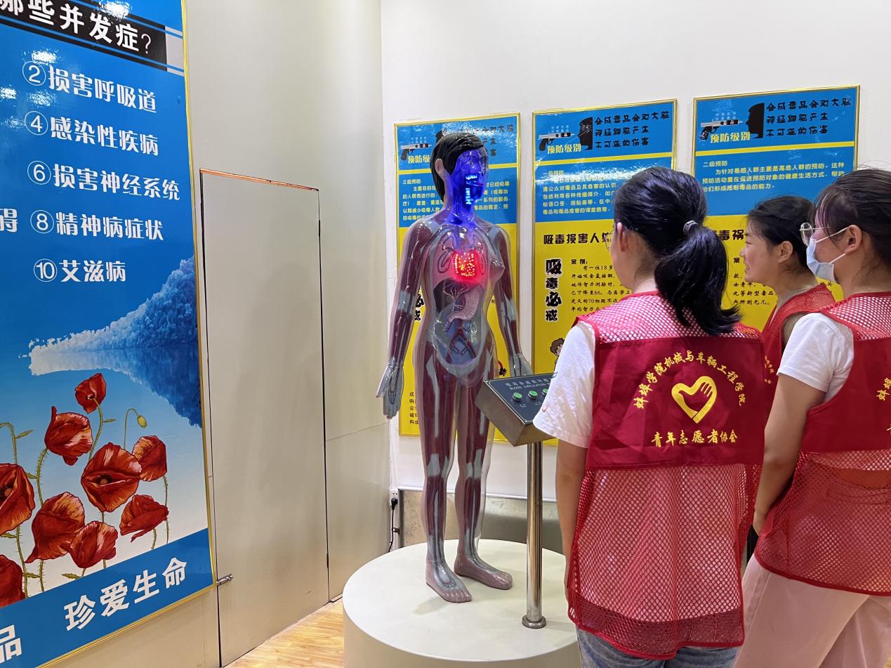 学习禁毒知识、了解毒品危害。活动第一站,实践团队前往蚌埠市禁毒基地,学习了解禁毒知识,团队成员先后参观了各类禁毒展板、智慧禁毒展厅、毒品仿真模型展览柜,学习中国禁毒史、毒品的危害与种类、禁毒法律法规、防毒小技巧等知识。为了让团队成员更加直观地、具体地了解毒品的危害,缉毒警察向成员们播放了虚拟人体吸食毒品的动画演示,展示了毒品带给人体身心的巨大危害。
