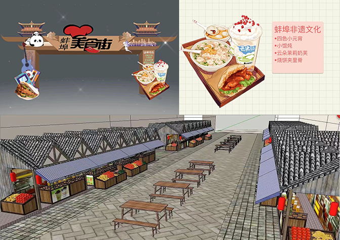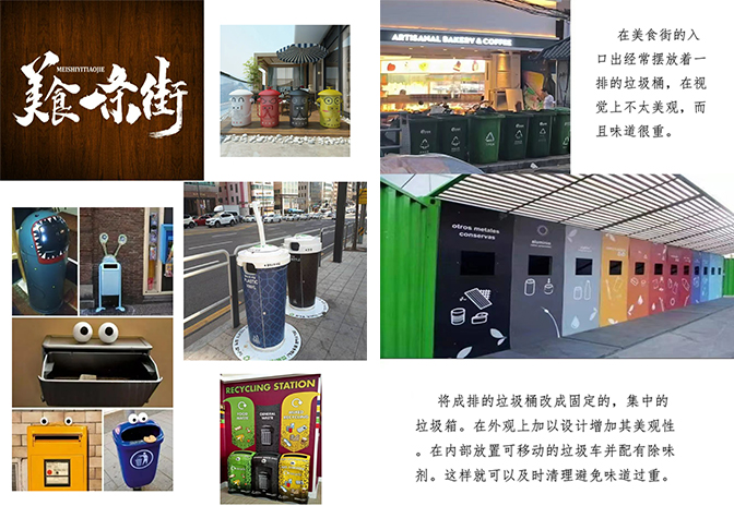 活动充分结合学生专业所学、开展实践活动服务地方经济社会建设。作品主要针对地委宿舍社区美食街休闲设施、标识设施方案的升级改造。活动前期,同学们在带队老师的指导下,组队走进地委宿舍社区美食街进行实地调研,认真分析街区现状和周边环境,统筹项目摊位特征、研究场地文化,以快适、便捷的设计理念为指导,提供了符合街道环境特征的智慧、时尚、古朴、简约等不同方案。
