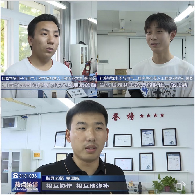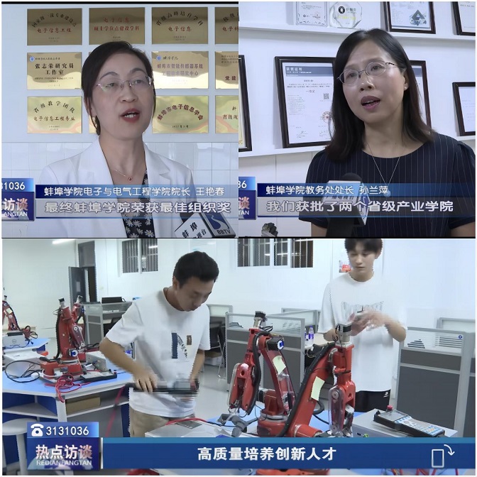 近日,蚌埠市广播电视台《热点访谈》栏目以“高质量培养创新人才”为专题,报道了蚌埠学院以“学科专业竞赛”为抓手,实施“3+1”校企协同人才培养,推动高校与蚌埠产业集群联动发展。其中,报道特别采访了蚌埠学院电子与电气工程学院“梦屿安秋”队在第十七届中国智能制造挑战赛全国总决赛中荣获一等奖的心路历程。