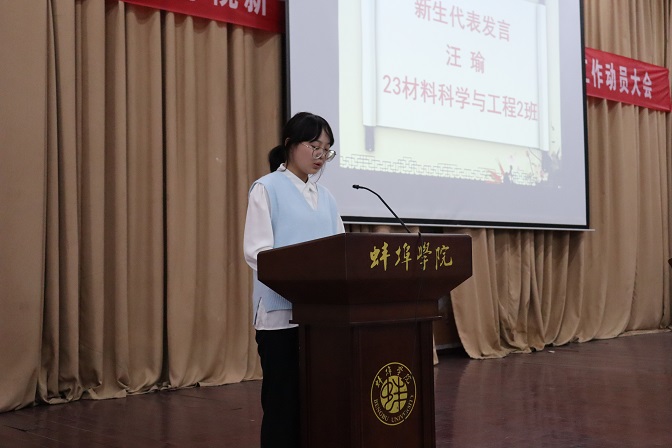 新生代表,2023级材料科学与工程2班汪瑜分享了入学以来的所见、所闻、所感、所悟,表示要立足新的起点,时刻牢记“笃学,重行,修德,立才”的校训,勤于学习、勤于锻炼、勤于实践,早日成为国之栋梁。
