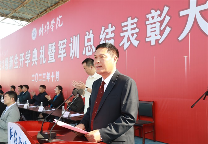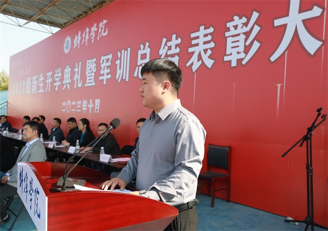 10月16日上午,蚌埠学院2023级新生开学典礼暨军训总结表彰大会在第一田径运动场举行。大会由学校党委委员、副院长郭有强主持,校领导及承训部队领导出席典礼。军训领导小组成员、各学院主要负责人,全体参训教官、新生辅导员、2023级新生参加典礼。