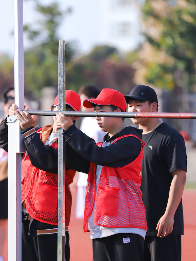 现场,志愿者们忙碌的身影遍布操场内外,同一时间里,邓昊宇在检录处,为百米赛跑核对号码牌;缪洁慧在横杆旁,为跳⾼比赛测量⾼度;王坤在沙坑里,为跳远比赛测量距离。