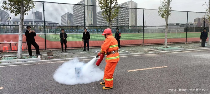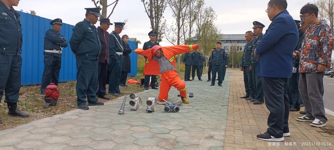 比赛共设置“队列会操、消防实操(消防服着装、水带连接、灭火器操作、灭火毯的操作)两大比赛项目,来自安徽科技学院保卫处、蚌埠医学院保卫处、蚌埠学院保卫处三所高校40余名安保选手参加。