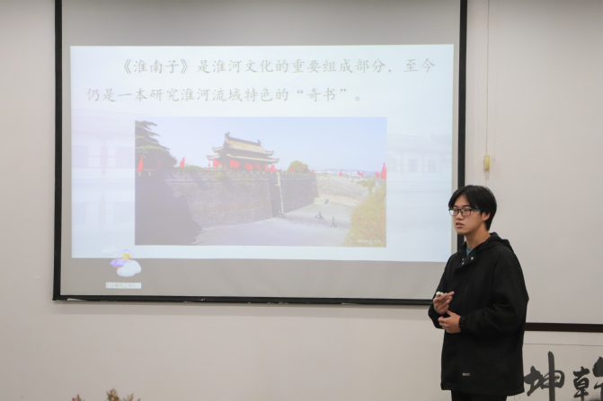 在学生分享环节,《一条大河波浪宽》的分享者将歌曲与解说相结合,介绍了治淮的历程,让整场解说显得别出心裁。《淮南子》的分享者从古学入手,延伸至今时的淮河生态,让大家对淮河生态文化有了更深的了解。穿插在解说中的三人组诗朗诵《我的南方和北方》,磅礴的气势道出了自然生态的发育与历史的沿革。来自2022级电气工程及其自动化专业的杨少鹏同学在解说中表示:“以激情书写治水华章,用奋斗铸就治淮伟业,让千里淮河万古流长、造福四方,为新中国治淮事业发展,我愿意献出全部的智慧和力量!”