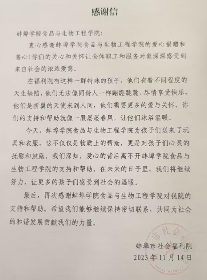 11月14日,蚌埠市红十字会举办捐赠仪式,仪式上蚌埠市社会福利院对蚌埠学院食品与生物工程学院爱心捐赠活动和善心表示感谢。座谈会上,蚌埠市红十字会表达长期与学院保持密切合作的意愿,下一步,双方将联合长期开展福利院陪伴关爱活动,引导大学生走进福利院,用心守护,真情陪伴成长!
