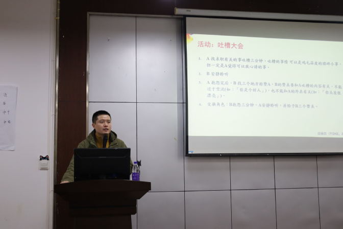 14日晚,结业仪式在大学生招聘室举行。结业式邀请到2004届环境工程优秀校友葛家求分享自身就业经验,葛家求现任安徽祥源科技股份有限公司常务副总,他鼓励学员提升个人专业能力、从兴趣出发合理选择职业并强调要积极融入团队,学会自我调节。